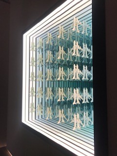 The artist’s “Mirror” works reflects upon his ideas on the notion of captivity and infinity. Gronquist achieves the sense of infinity by using glass and light. As the light gets through the glass, images inside are seen as fading backwards into an endless continuity which makes the viewer question life and death, and which is more important.